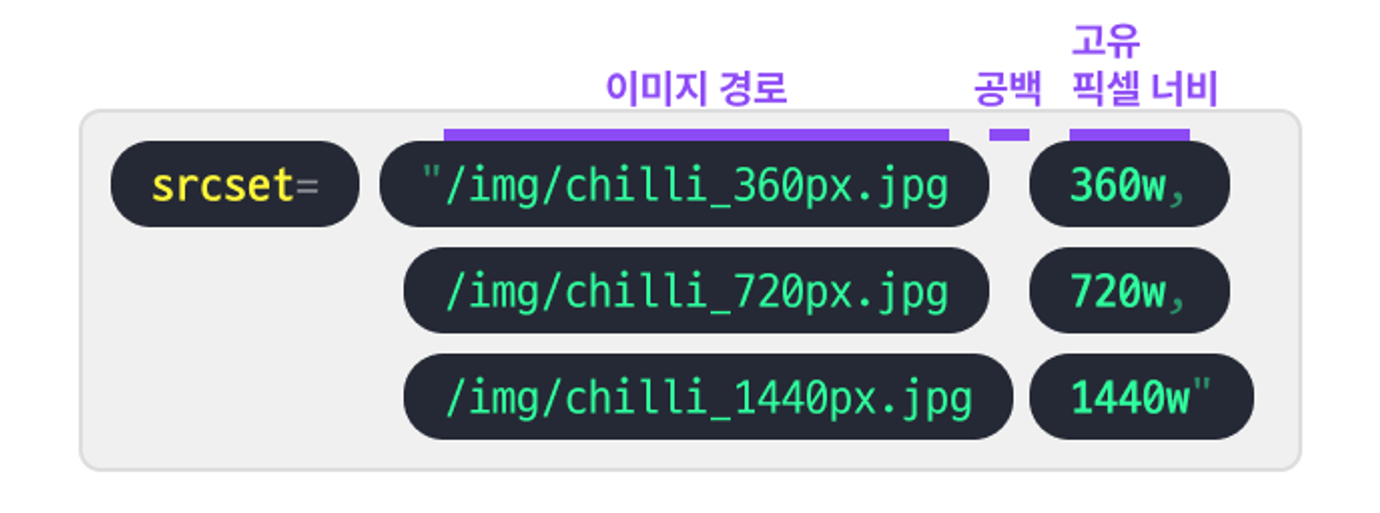 - 브라우저가 네트워크, 메모리, 성능, 시간 등을 고려하여 최적의 이미지를 선택