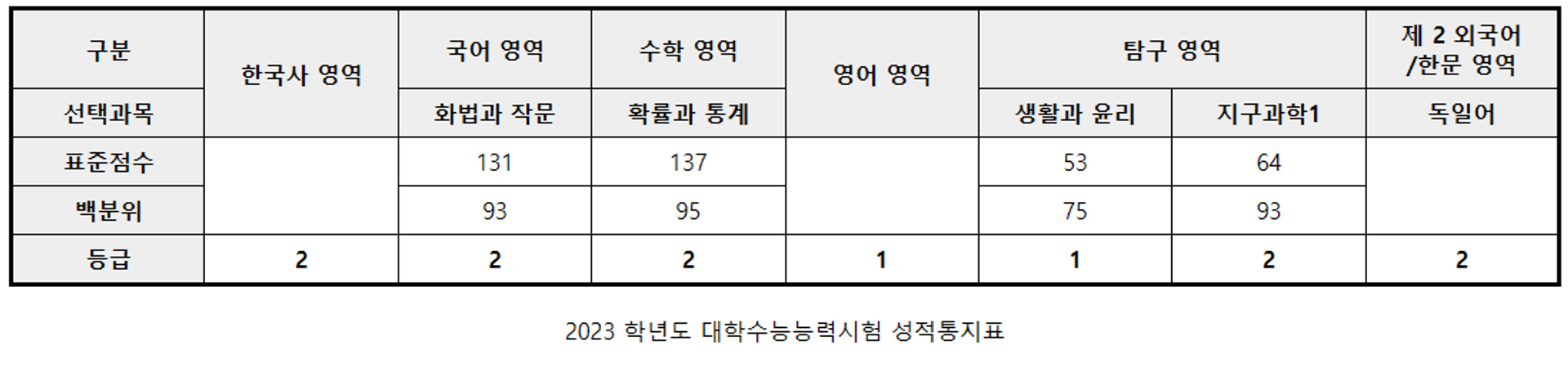 <caption>2023 학년도 대학수능능력시험 성적통지표</caption>
