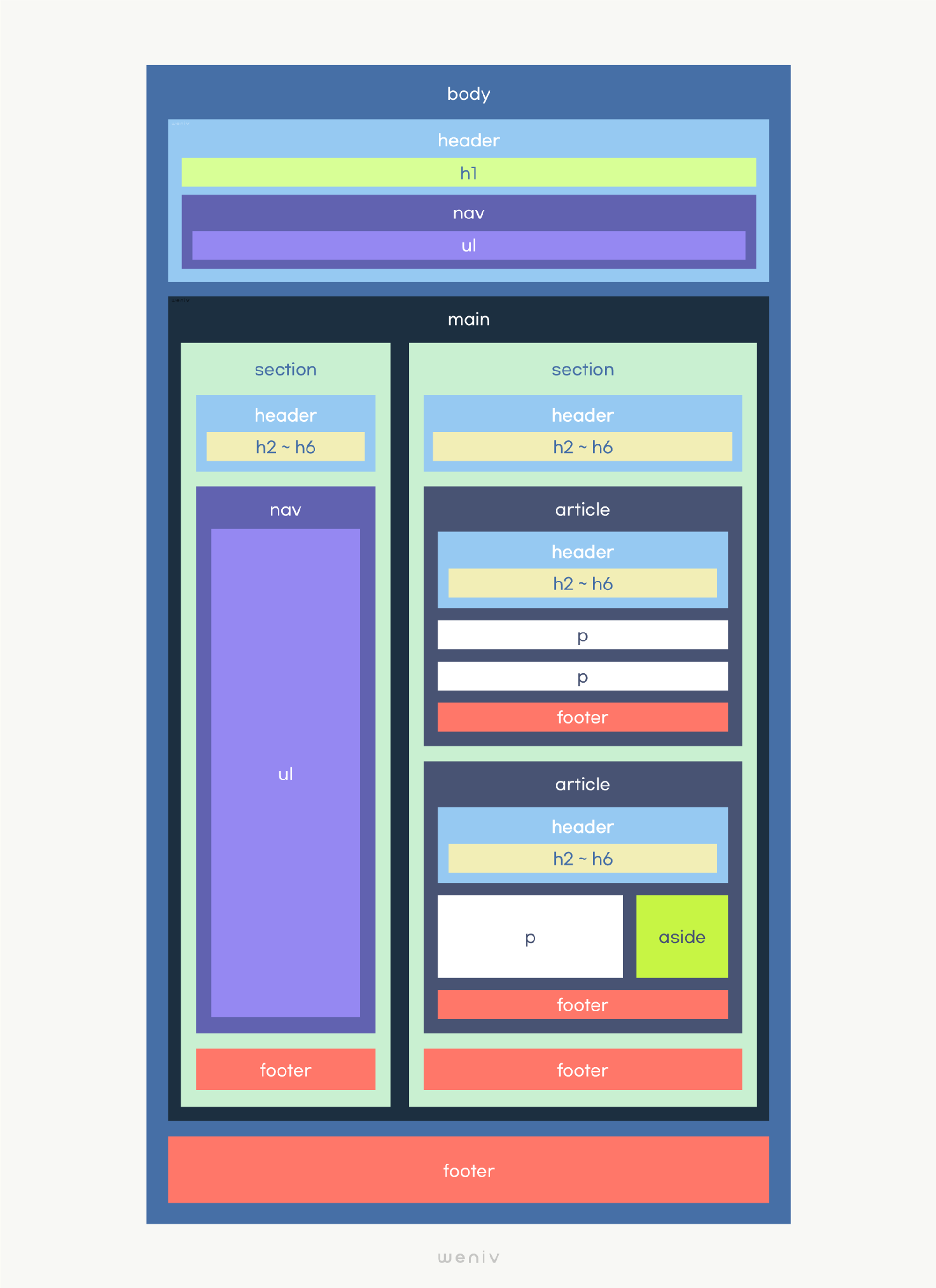 - HTML 문서가 여러 섹션으로 구성되어 있을 때, 각 섹션의 시작 부분에 <header> 사용가능