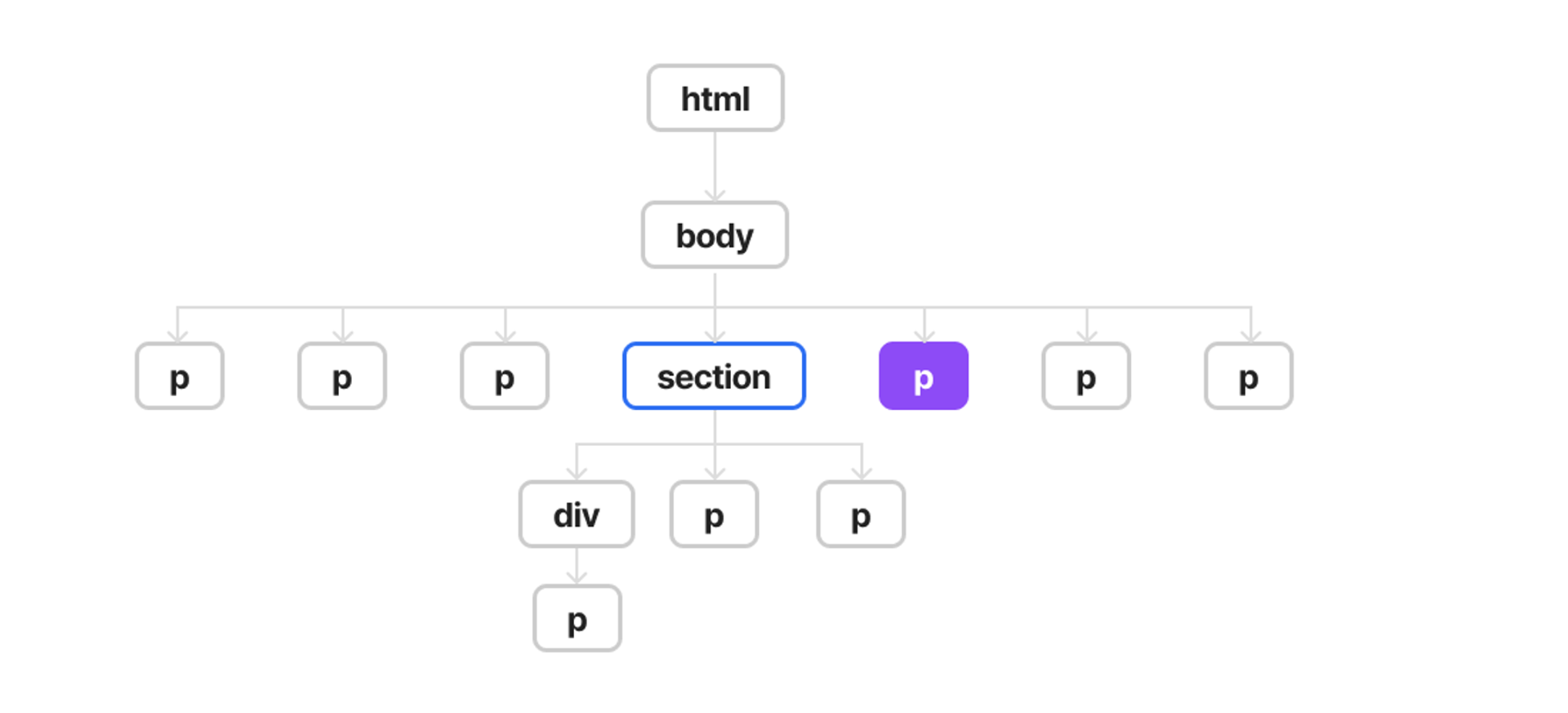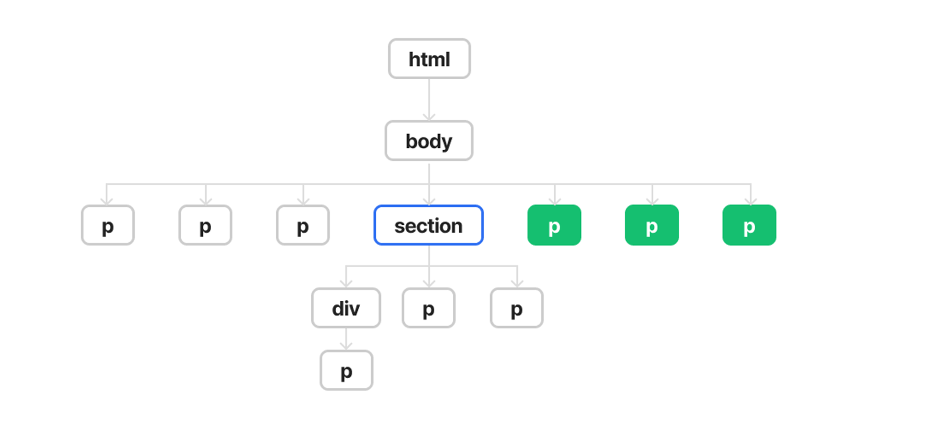 - section의 color속성은 자식인 h1, h2, p에게 상속 됨